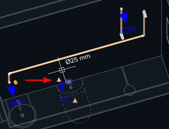 Observação: Alguns pontos hidráulicos são programados para adicionar automaticamente pontos a tubulação levando a uma distância definida para o centro da parede, como é o caso do Lavatório.