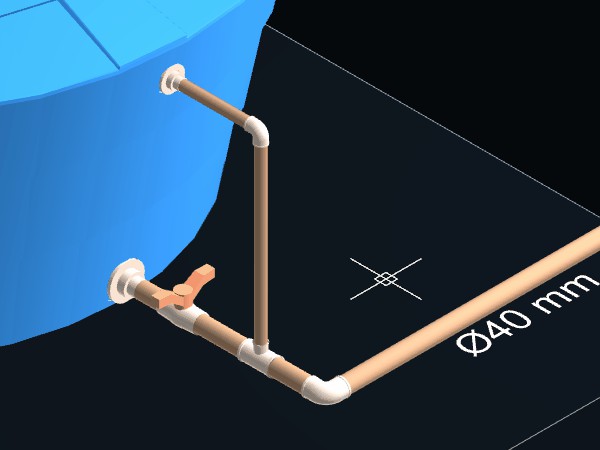As tubulações deverão ser ligadas. Uma peça de conexão Tê de redução 40x25 mm deverá ser criada no ponto de interseção entre as duas tubulações.