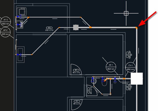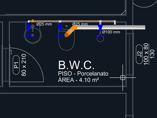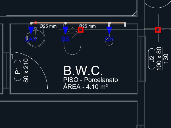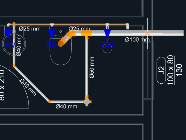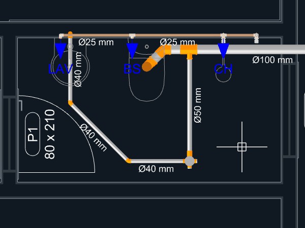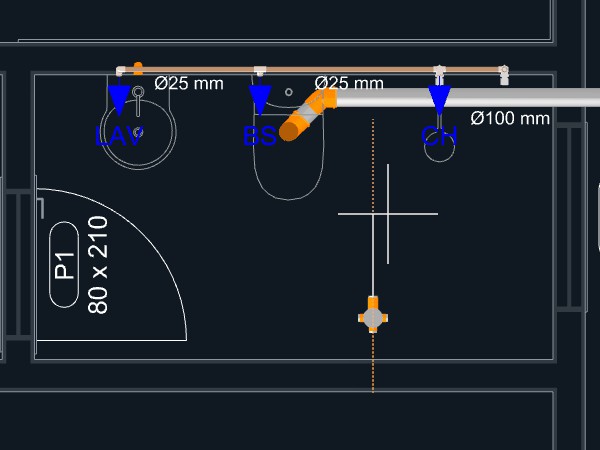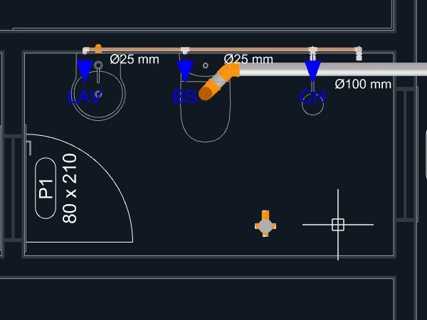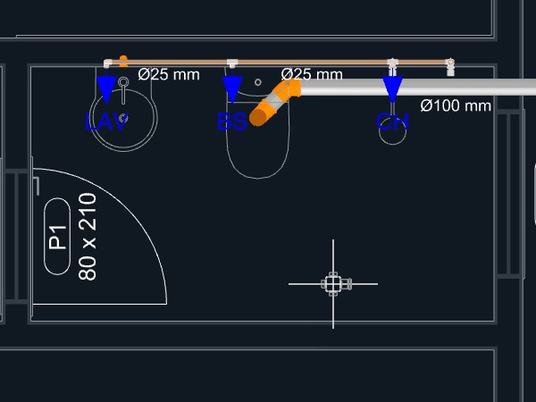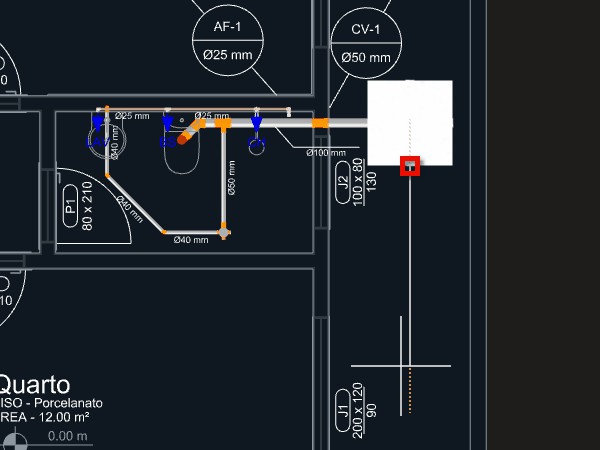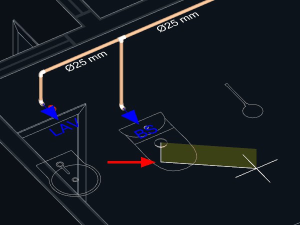 Observação: Quando uma tubulação de esgoto é iniciada a partir de um aparelho com a direção de saída apontando para o piso, um ponto será adicionado automaticamente levando a tubulação para o nível abaixo do piso.