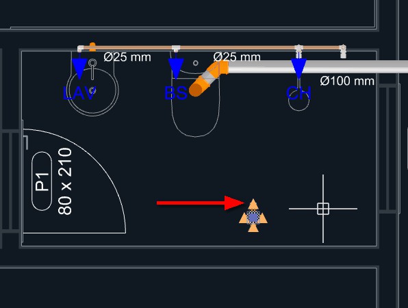 Clique sobre o triângulo laranja no ponto central do aparelho, onde se localiza a saída para o esgoto sanitário, para dar início ao lançamento da tubulação;
