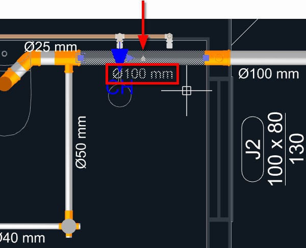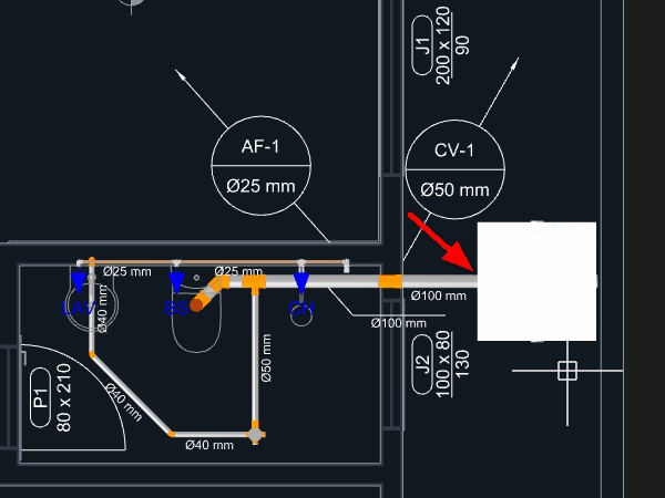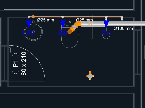 Observação: Quando uma tubulação de esgoto é iniciada a partir de um aparelho com a direção de saída apontando para o piso, um ponto será adicionado automaticamente levando a tubulação para o nível abaixo do piso.