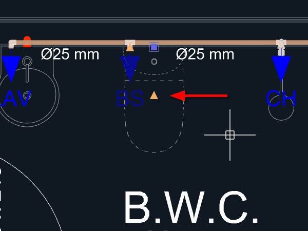 Clique sobre o triângulo laranja no ponto central do aparelho, onde se localiza a saída para o esgoto sanitário, para dar início ao lançamento da tubulação;